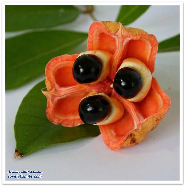 يشبه شكلها شكل الكمثرى وعندما تنضج، فإن لونها الأخضر يتحول إلى اللون الأحمر، الأصفر والبرتقالي. تنقسم الثمرة إلى ثلاثة أقسام مفتوحة لتظهر بداخلها بذور سوداء لامعة كبيرة يمكننا رؤيتها مباشرة، أما نصفها الآخر فهو دسم إسفنجي أبيض إلى أصفر اللون يكون عادة مغطى بالقشرة الخارجية فلا يمكن رؤيته بشكل مباشر، ويصل وزن الثمرة عادة من 100 إلى 200 غرام.