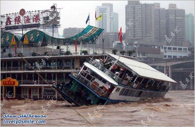مياه الفيضانات تدمر أحد القوارب في الصين