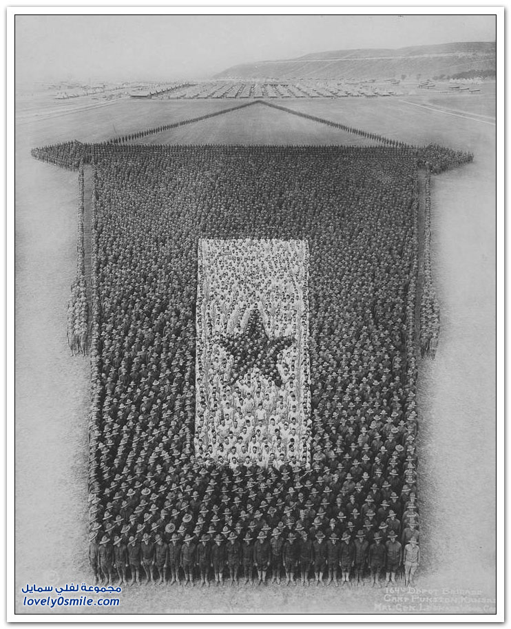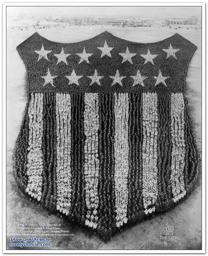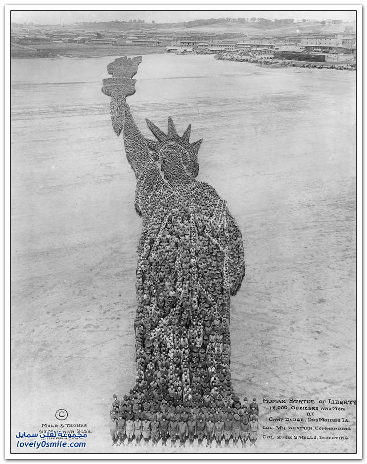 عام 1917م 18 ألف جندي وضابط يشكلون تمثال الحرية في معسكر دودج، أيوا.