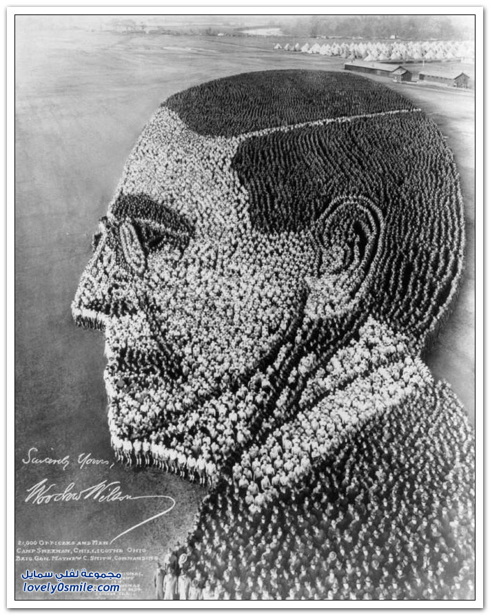 عام 1918م 21 ألف جندي وضابط يشكلون صورة وودرو ويلسون في معسكر شيرمان، أوهايو.
