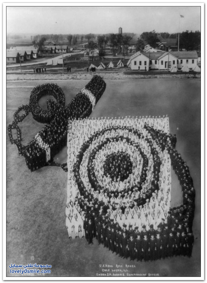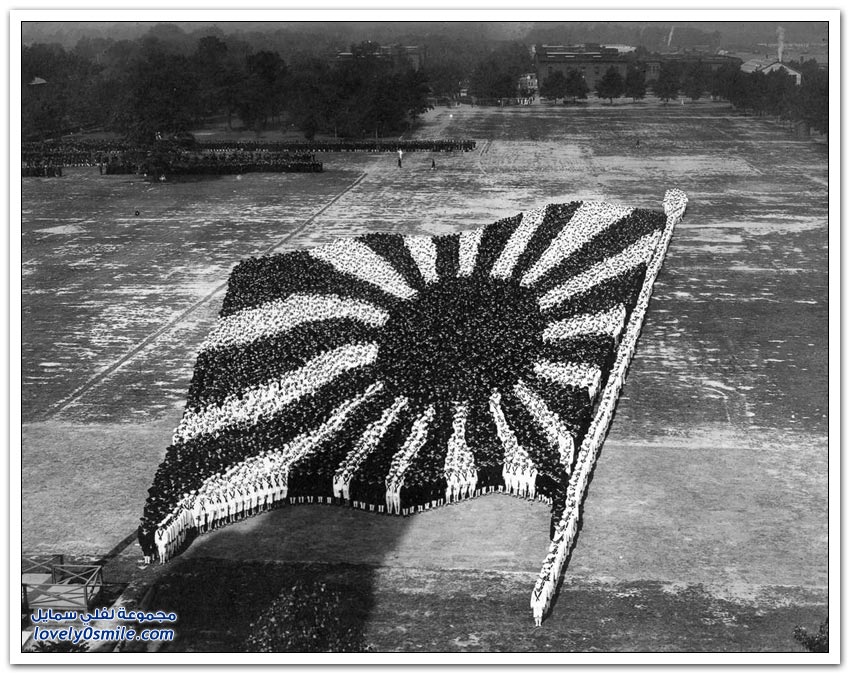 عام 1917م جنود وضباط من البحرية الأمريكية يشكلون العلم الياباني في ولاية إيلينوي.