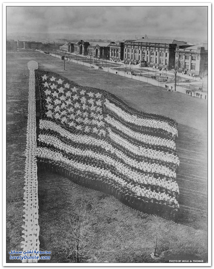 عام 1917م جنود وضباط من البحرية الأمريكية يشكلون العلم الأميركي في ولاية إيلينوي.