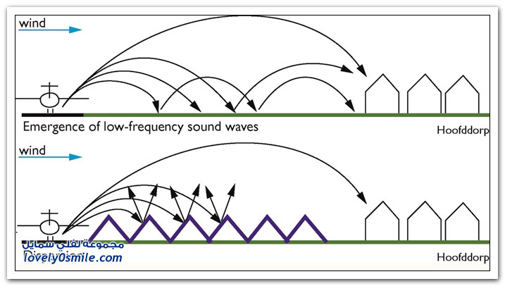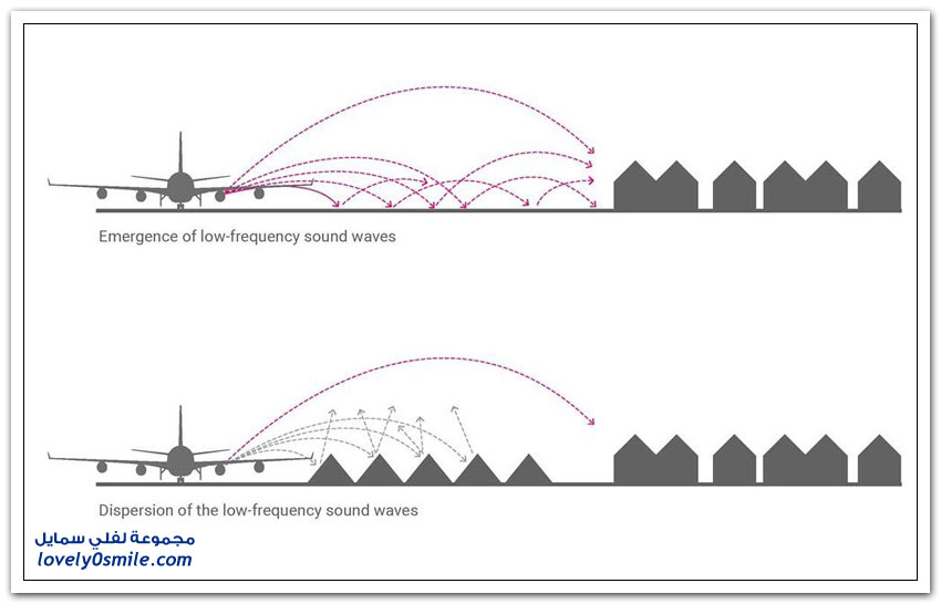 - وبطريقة حسابية، جعل المسافة بين تلك الخنادق مناسبة لتقطُّع الموجات الصوتية وعدم وصولها إلى المنطقة السكنية.