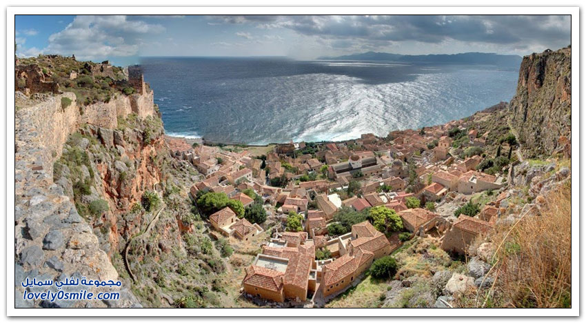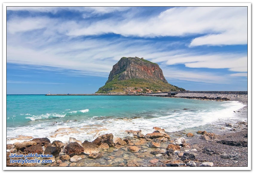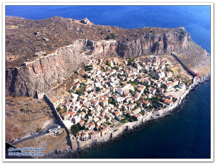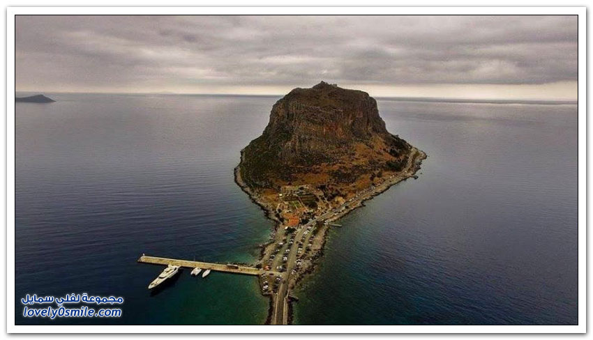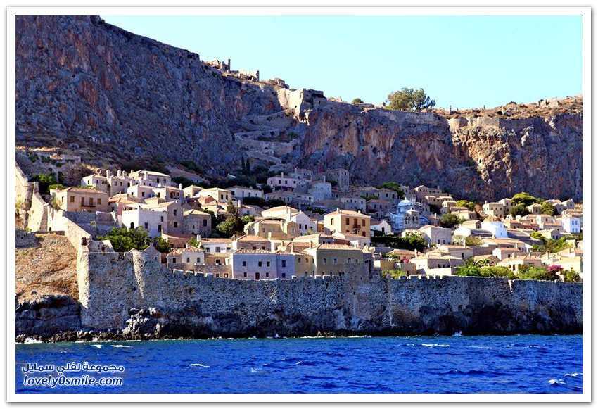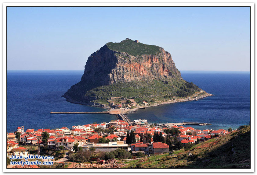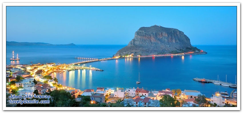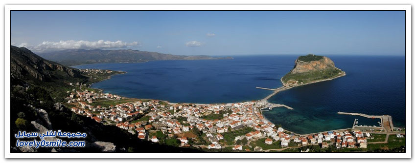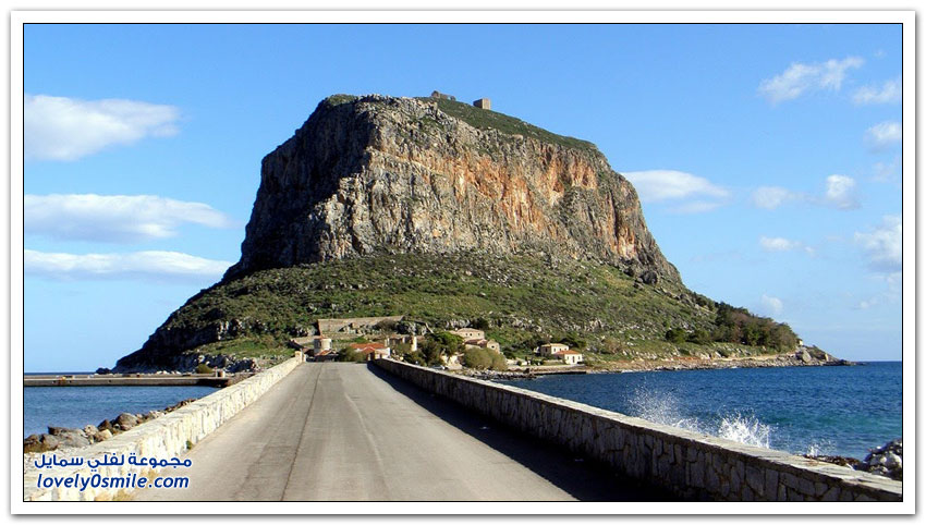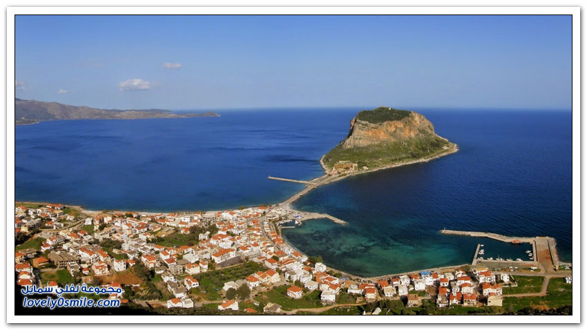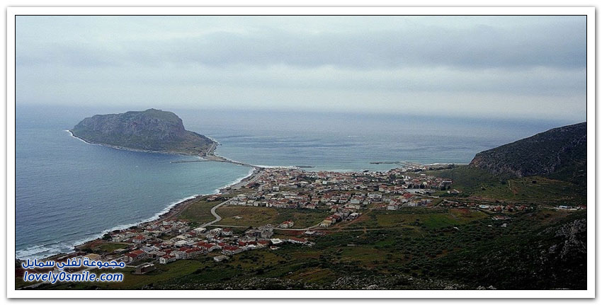 * مدينة مونيمفاسيا، خلف صخرة بحرية ضخمة، وفي مكان محاط بالمياه من كل جانب تتخذ هذه المدينة اليونانية الصغيرة موقعاً جذاباً جعلها تعرف بالمدينة المخفية، حيث بنيت بشكل غير مرئي تجنباً لهجمات العدو، وهي منحوتة بشكل كامل على الجانب الخلفي من صخرة البحرالضخمة منذ العصور الوسطى.