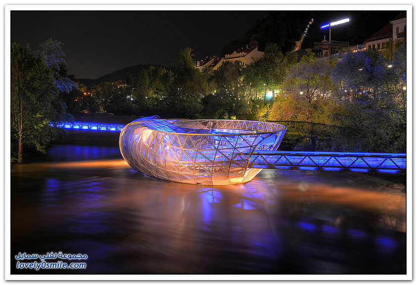 - هي جزيرة اصطناعية أُنشأت بعد عام 2003م بعد إعلان غراتس عاصمة الثقافة الأوروبيّة، وتقع هذه الجزيرة وسط نهر بالمر لتربط بين طرفي المدينة ببعضهما، ومن حيث تصميم الجزيرة فهي جزيرة مصنوعة من الفولاذ والزجاج تشبه في شكلها شكل الصدفة النصف المفتوحة بلونها الأزرق الشفاف، وصمم هذه الجزيرة الفنان الأمريكي فيتوأكونيسي، وما يُدهش في هذه الجزيرة هو القسم الذي يقع تحت الماء كقبة زجاجية تسمح للسياح والزوار بشرب القهوة والشاي والاستمتاع برؤية المدينة والنهر، أما القسم الأعلى فيها فهو يضم مقاعد تصلح لإقامة الإحتفالات فيها.