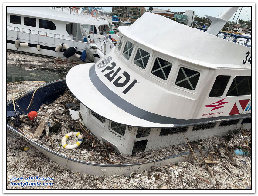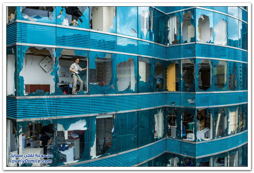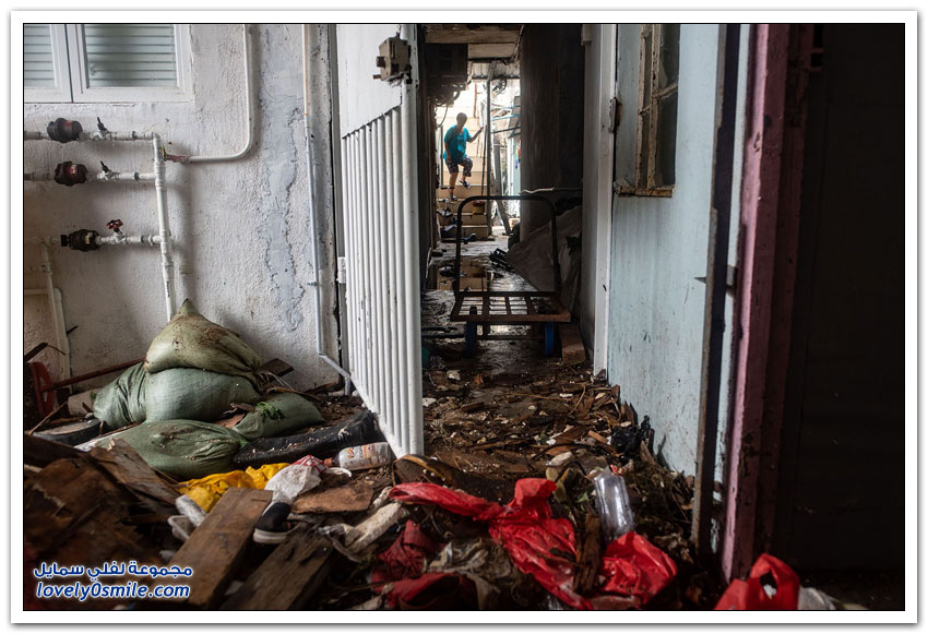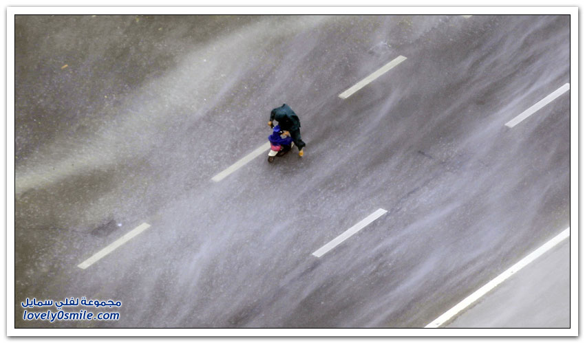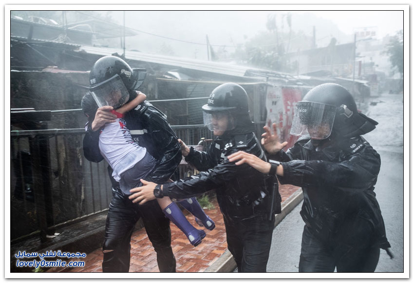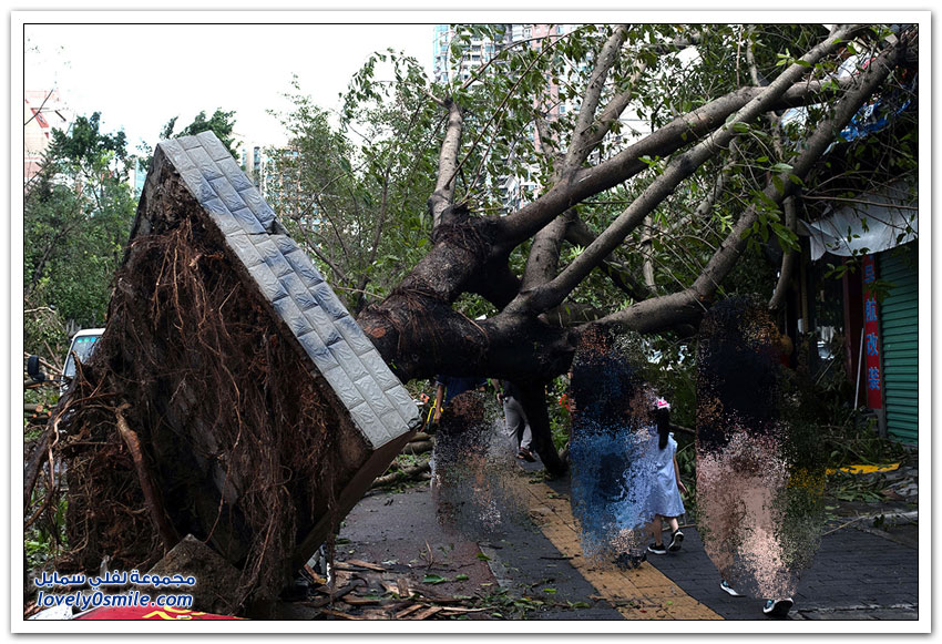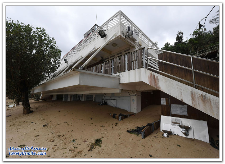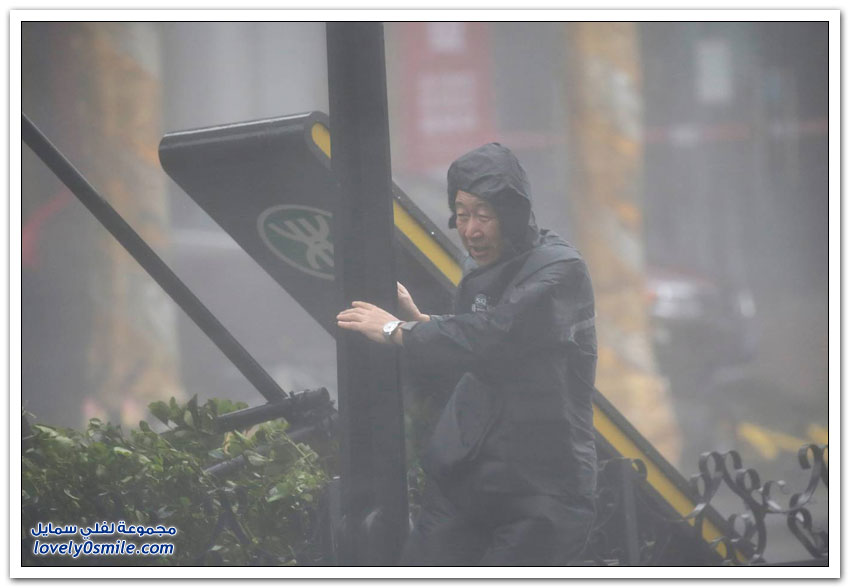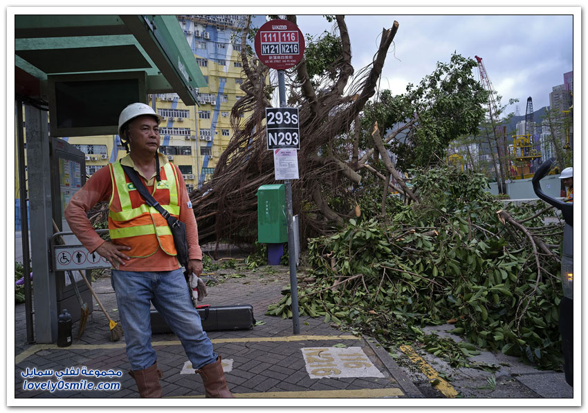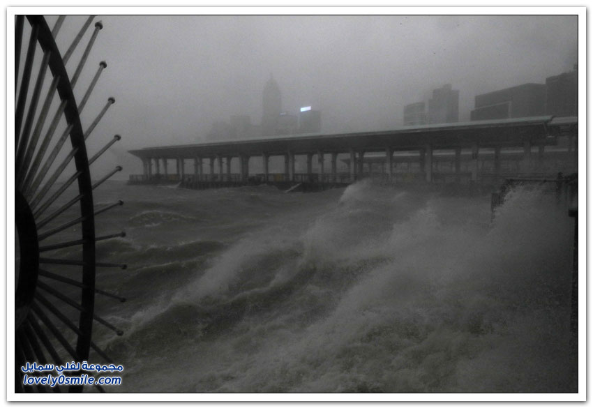 - وبدت شوارع هونغ كونغ التي تكون عادة مزدحمة جدًّا مقفرة بالكامل، في حين ضربت الأمواج العالية شواطئ الخليج.