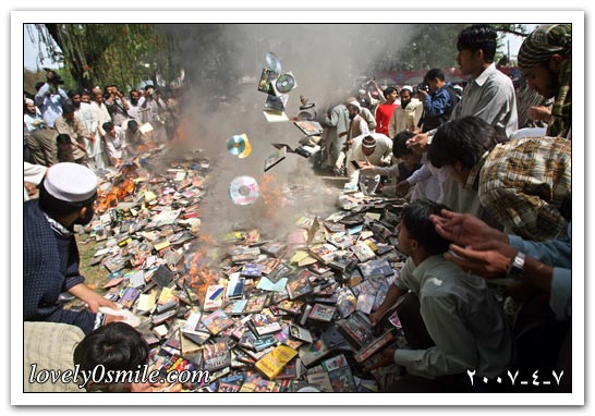 باكستانيون يدمرون آلاف الأقراص المدمجة وشرائط الفيديو المسيئة للتقاليد في العاصمة إسلام آباد.
