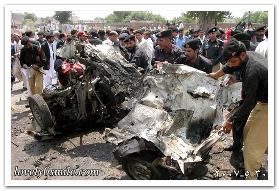 الشرطة الباكستانية تفحص حطام سيارة انفجرت أمام محكمة في مدينة بيشاور ما أدى إلى إصابة 9 أشخاص.