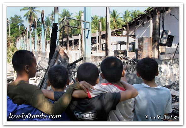 أطفال مسلمون أمام حطام مدرستهم التي التهمها الحريق في محافظة يالا جنوبي تايلاند.