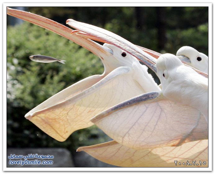 البجع الأبيض يتغذى على أسماك الزائرين في أحد متنزهات مدينة يوكوهاما اليابانية.