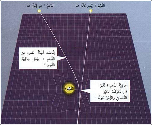 - ترتئي النظرية النسبية أيضاً أن الجاذبية الفائقة القوة، كتلك المتواجدة على مقربة من أحد النجوم، يمكنها (حَنيُ) الحيز الفضائي، بحيث تتقوس الخطوط المستقيمة – فلا شيء ثابت في الكون سوى سرعة الضوء التي تبلغ 300000 كيلومتر في الثانية.