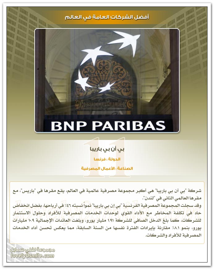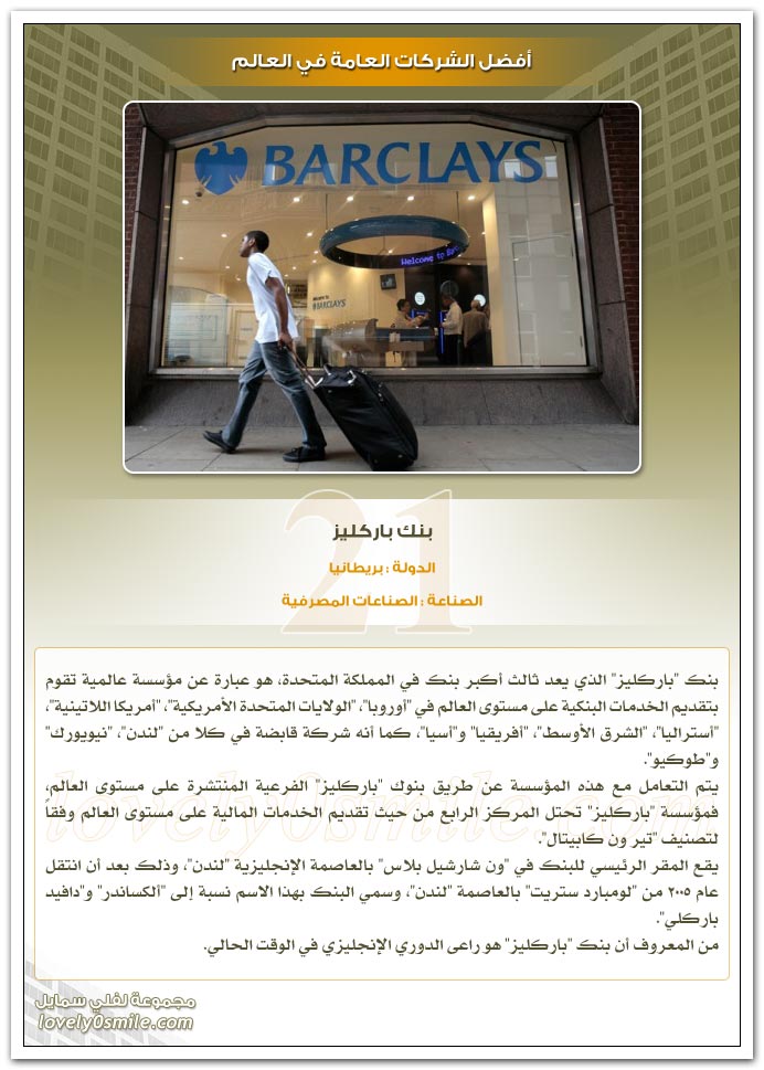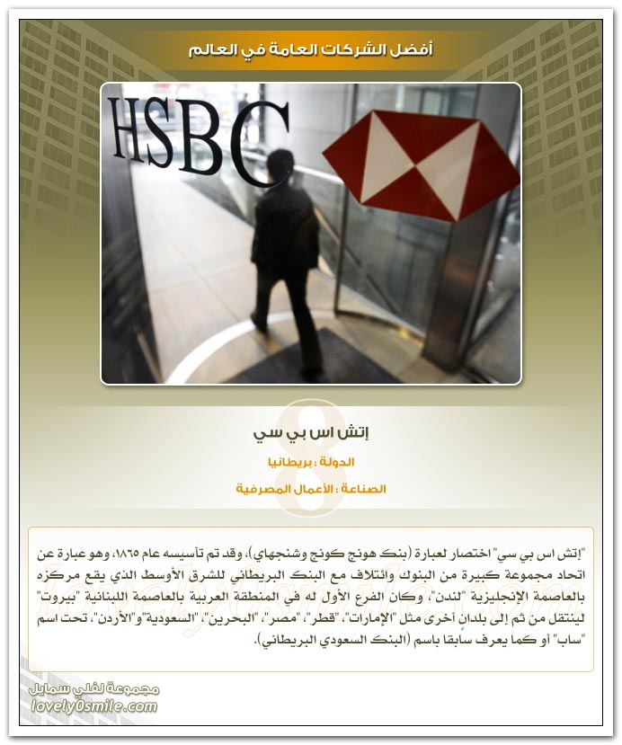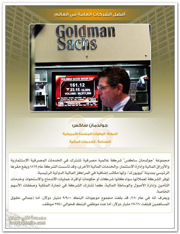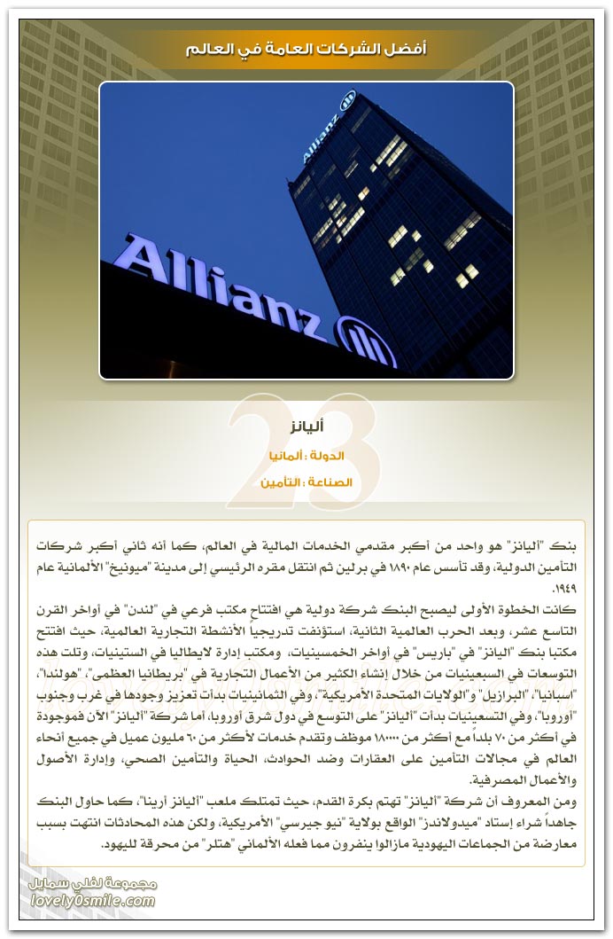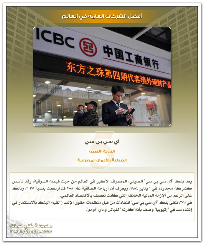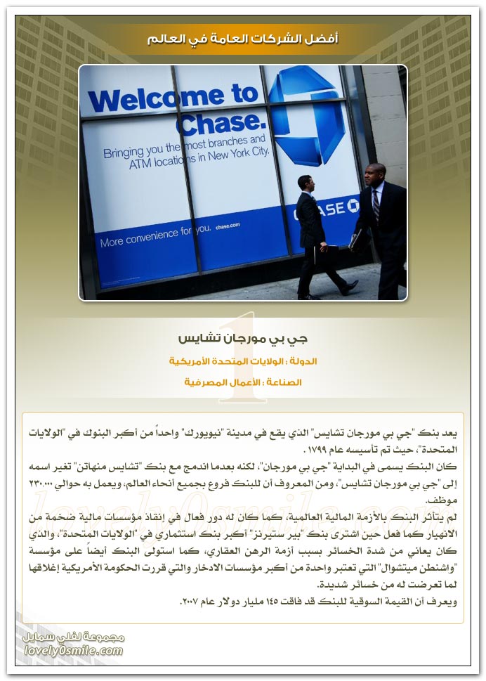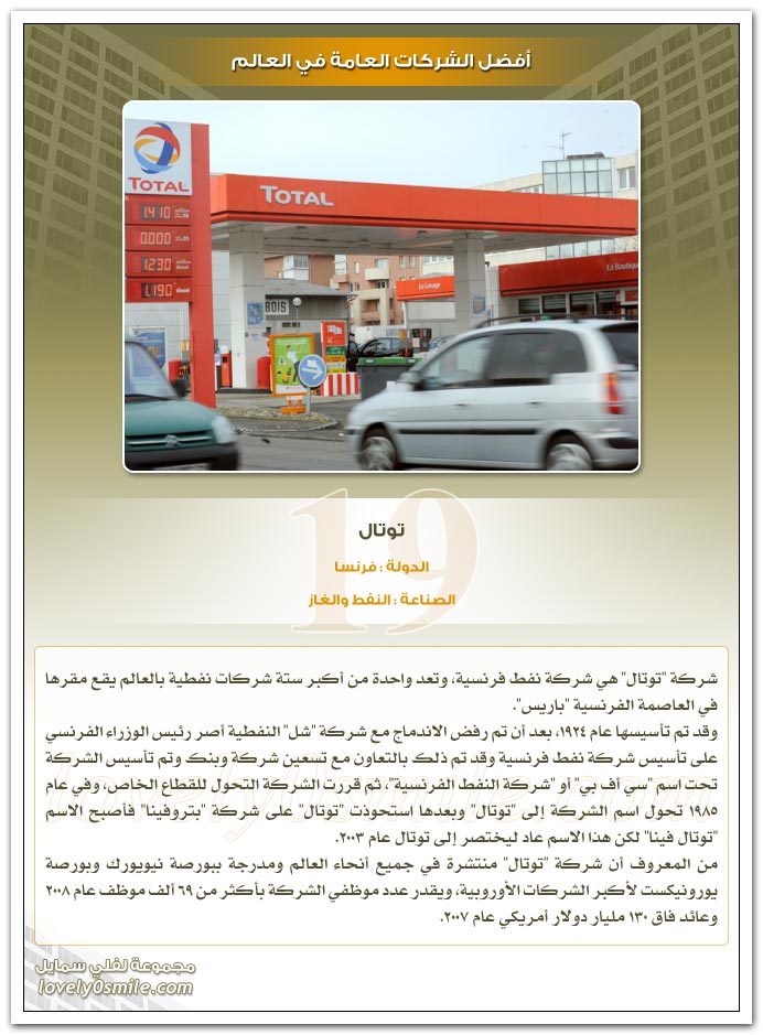 * تعد هذه الشركات من أفضل الشركات علي مستوي العالم ، حيث تم ترتيبها وفقاَ للقيمة السوقية لهذه الشركات ، وكذلك حجم الأرباح التي تحققها ...