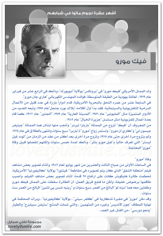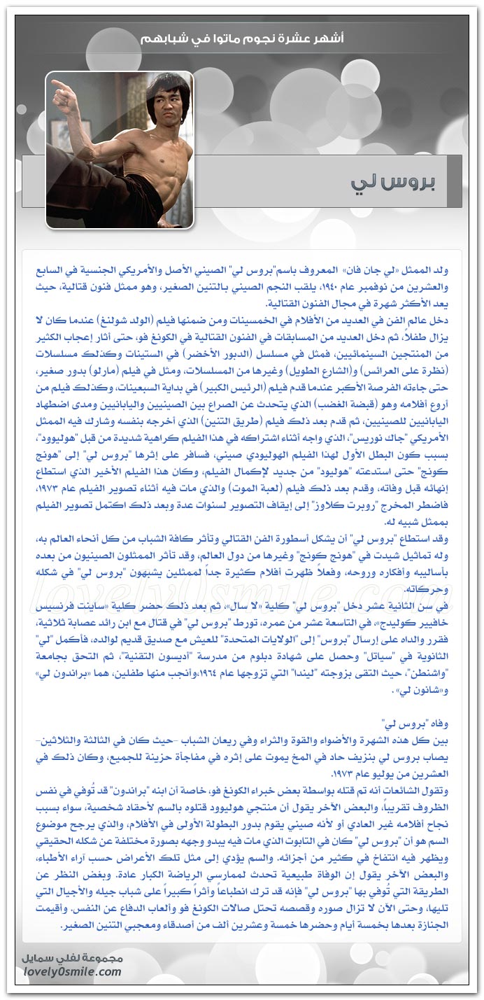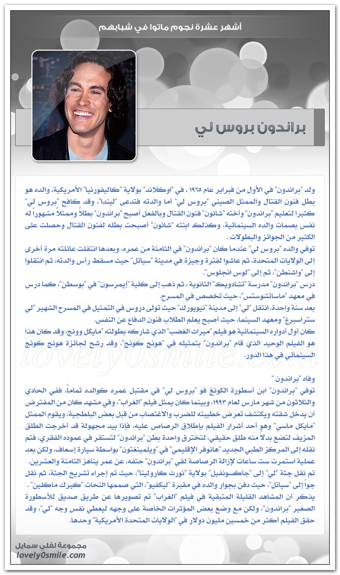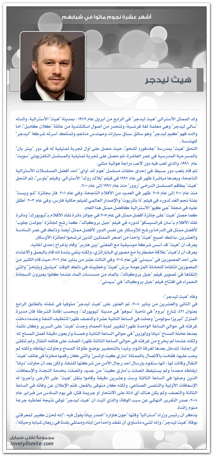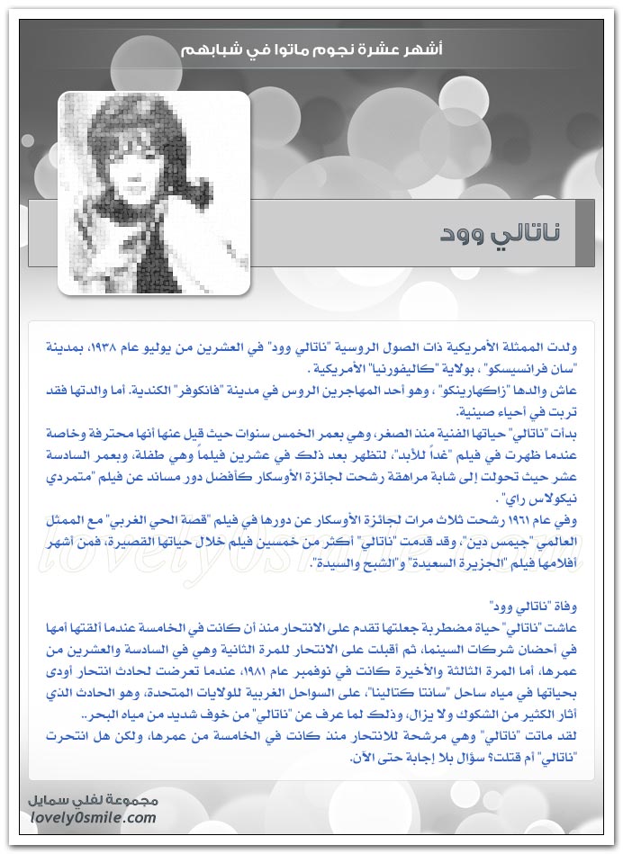 - والآن سنتعرف علي بعض أشهر الحالات، من "ناتالي وود" إلى "هيث ليدجر" ومن "بروس لي" إلى "توباك شاكور"، لنعرف أن المصير الحقيقي لبعض النجوم السعداء ظاهرياً، يغلفه الإخفاق في الحصول علي السعادة والتي تنتهي في الغالب بحياة مفقودة.