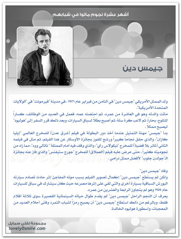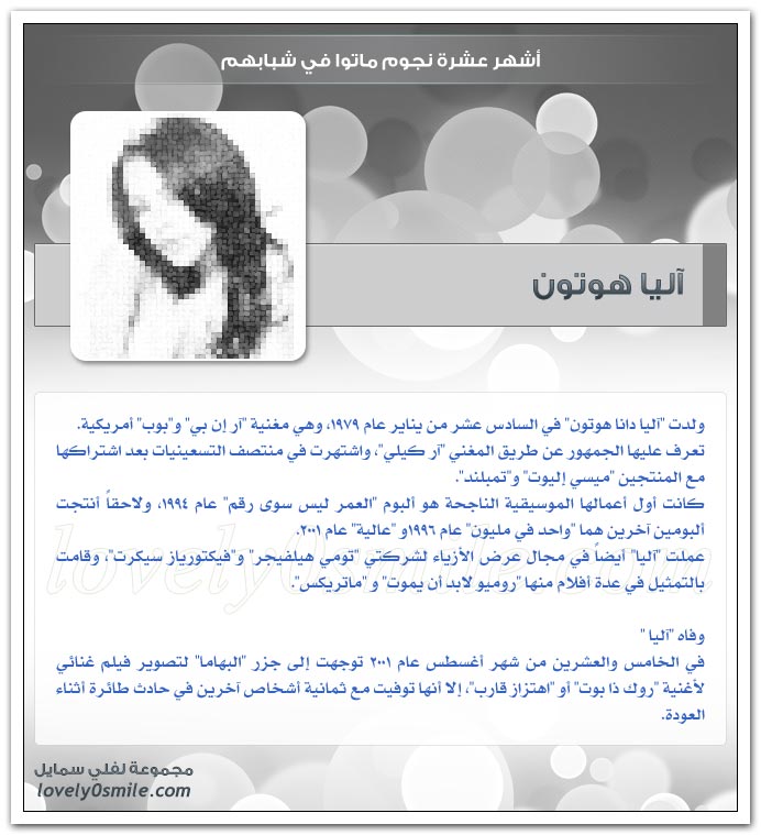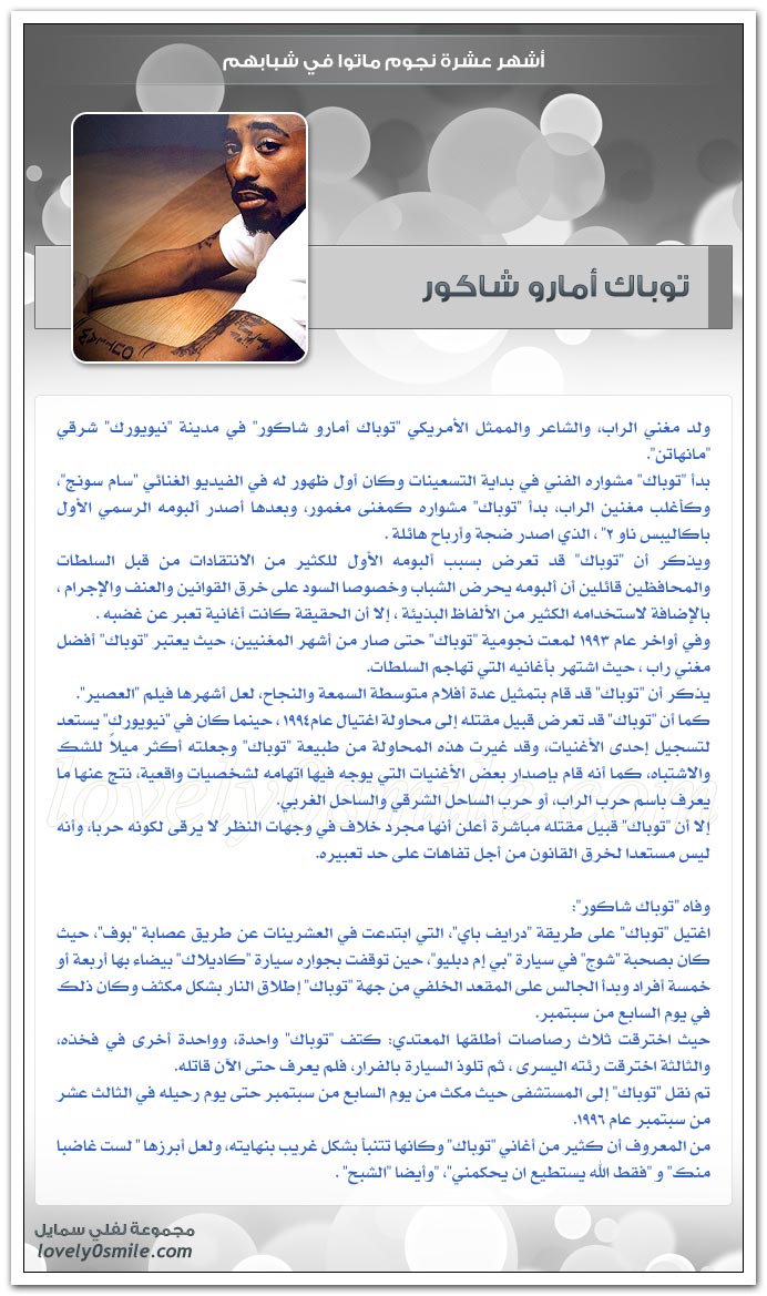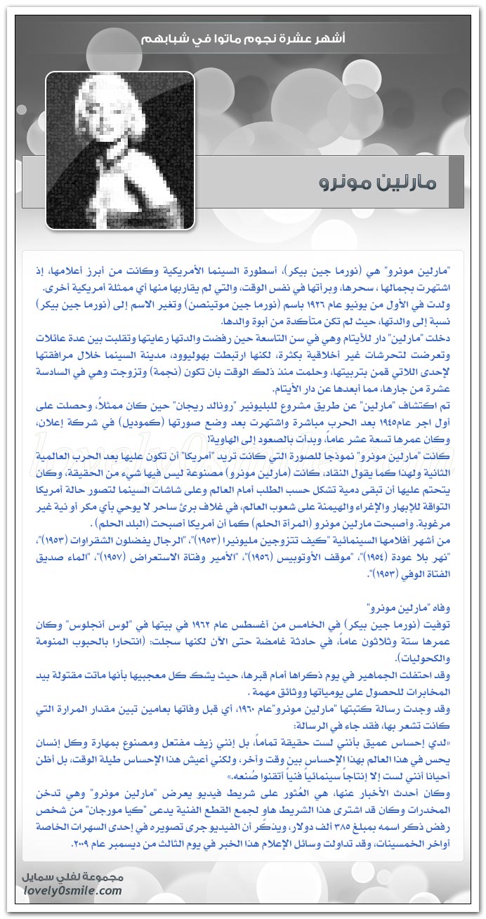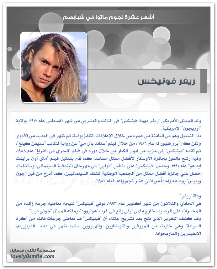 - والآن سنتعرف علي بعض أشهر الحالات، من "ناتالي وود" إلى "هيث ليدجر" ومن "بروس لي" إلى "توباك شاكور"، لنعرف أن المصير الحقيقي لبعض النجوم السعداء ظاهرياً، يغلفه الإخفاق في الحصول علي السعادة والتي تنتهي في الغالب بحياة مفقودة.