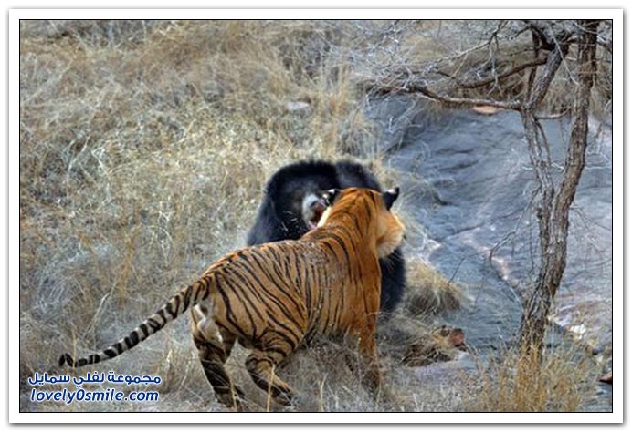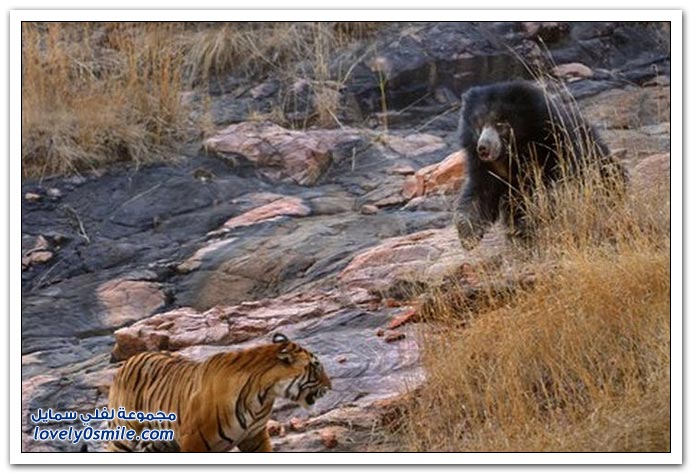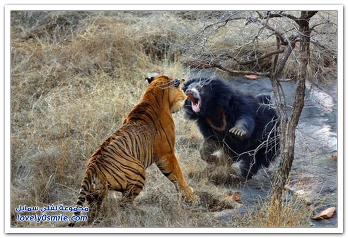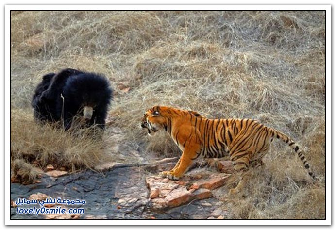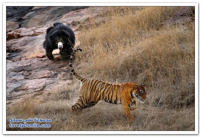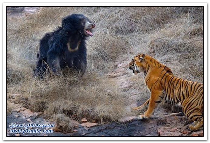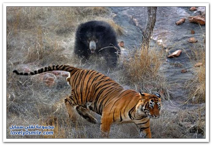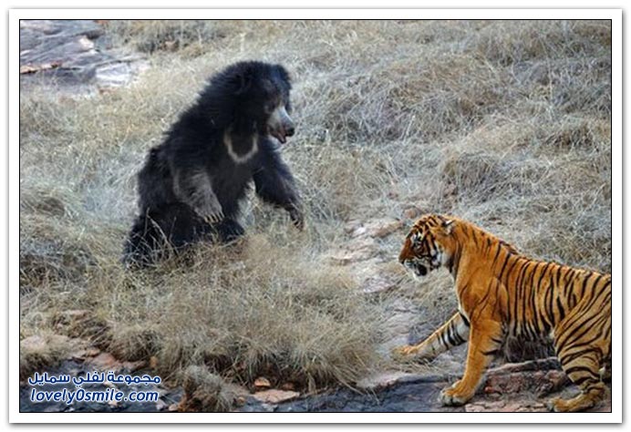الدب يدب خطر هجوم النمر على صغاره وقد فهم النمر ذلك وولى عنه وهناك بعض الآدميين يعتدون على الآخرين و لا يعتبرون