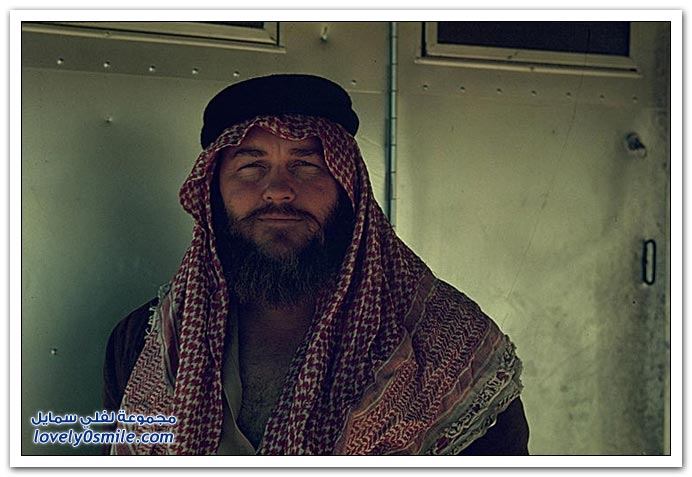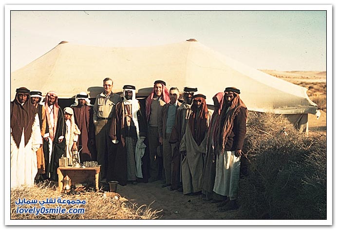 4- الرحالة مع البدو من اليسار إلى اليمين: مجهول- خميس- مجهول- سيسل- توم بارجر- جوني توماس- مجهول ( x, Khamis, x, Cecil, Tom Barger, Johnny Thomas, x)