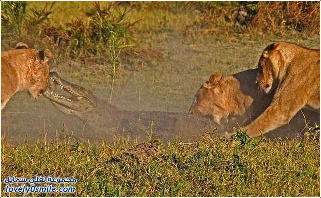 ثلاث أسود ضد تمساح