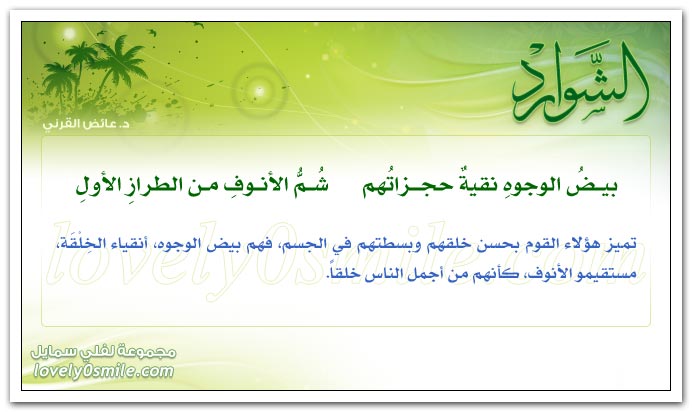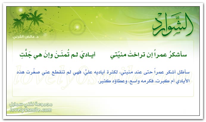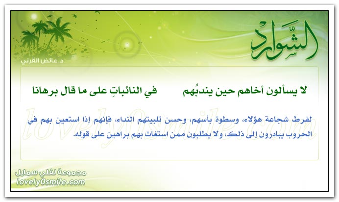 ولد الهدى فالكائنات ضياء **وفم الزمان تبسم وسناء **الروح والملأ الملائك حوله *للدين والدنيا به بشراء والعرش يزهو والحظيرة تزدهي ومساؤه بمحمد وضاء *** يوحي إليك الفوز في ظلمائه متتابعا تجلى به الظلماء *** والآي تترى والخوارق جمة *** جبريل رواح بها غداء