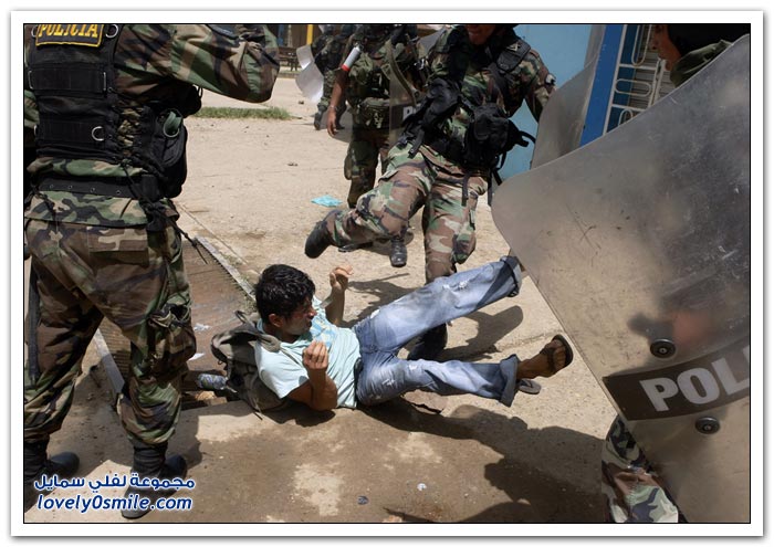 عامل غير رسمي لأحد مناجم الذهب يعامل بقسوة من قبل شرطة مكافحة الشغب في بيرو خلال اشتباكات في بلدة بويرتو مالدونادو، بيرو في 14 آذار، 2012. وقد أعتقل أكثر من ستين شخصا، وقتل ثلاثة أشخاص على الأقل، وجرح 29 خلال احتجاجات ضد قرار الحكومة الجديد والذي يجرم نشاط التعدين الغير قانوني.