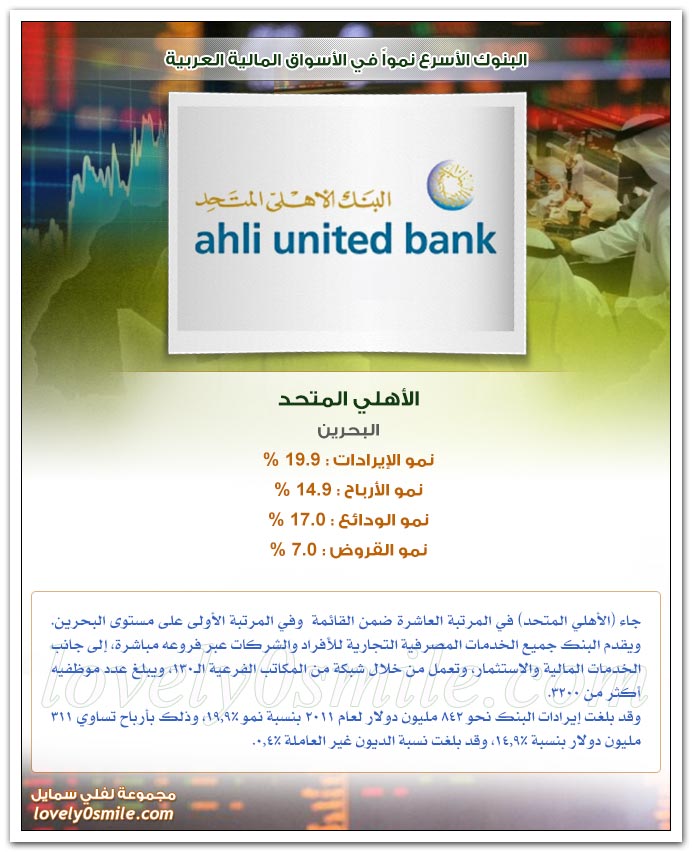 * متابعة حركة البنوك من عامٍ إلى آخر مهمٌّ جداً لمعرفة أداء المصرف أو البنك ، مما يسهم فيه هذا القطاع في اقتصاد الدول العربية، وتبنى عليه قرارات حاسمة من قبل المستثمرين، لذلك قمنا بنقل دراسة نمو البنوك المدرجة في أسواق المال العربية حسب بياناتها المالية عن الفترة المنتهية في 31 ديسيمبر/كانون الأول 2011 ومقارنتها بالبيانات المالية لنفس الفترة لعام 2010.