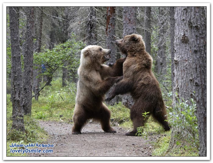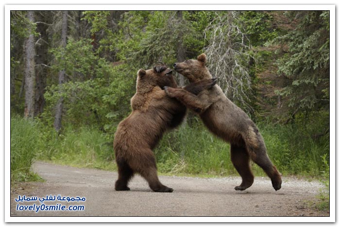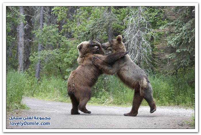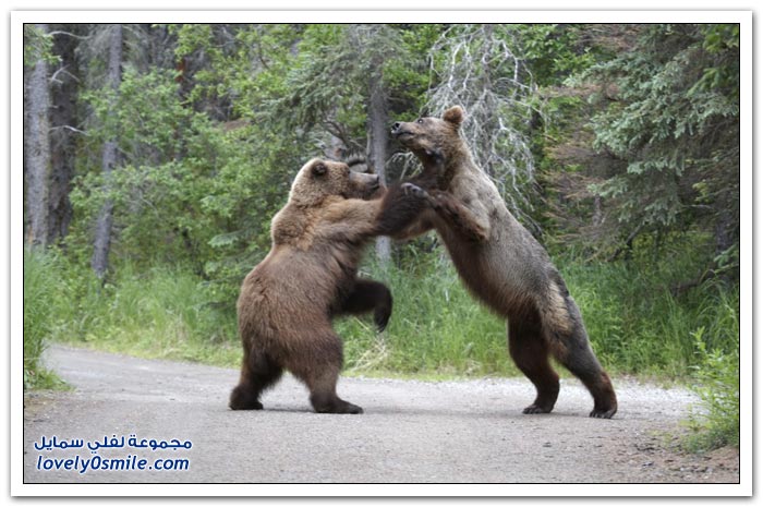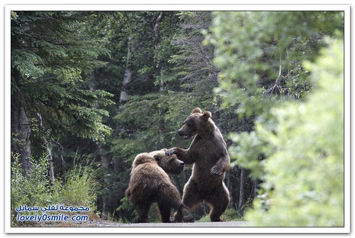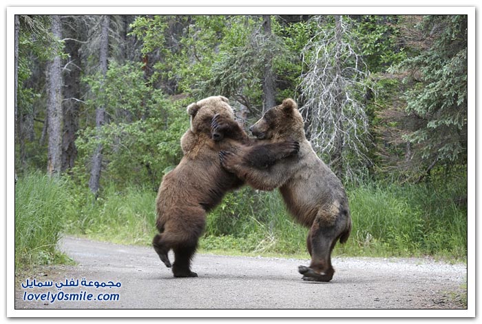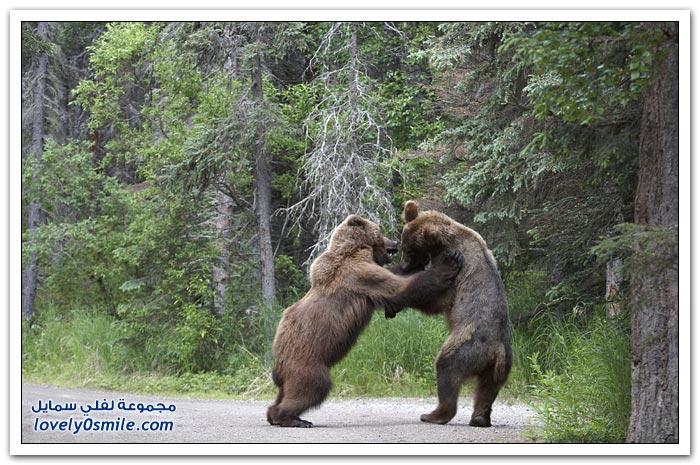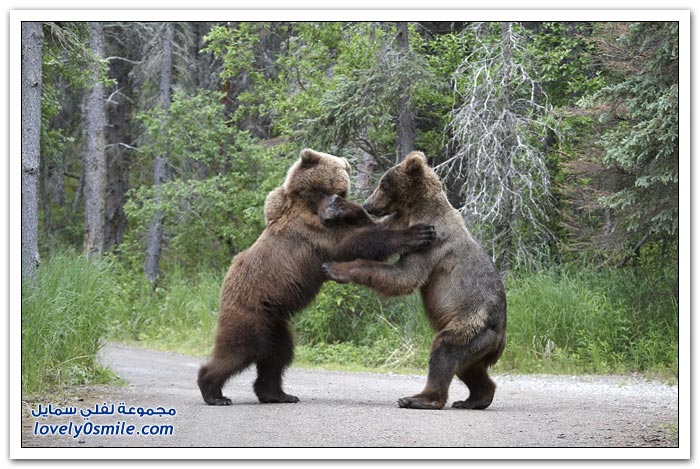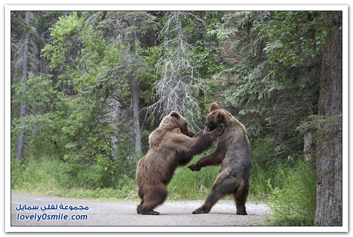 * في ألاسكا صراع بين الدببة الرمادية الضخمة جدا على سمكة سلمون بينما كان احدهم يقوم بسرقة السمكة من الأخر , وتعتبر هذه اللقطات نادرة ومميزه لمن اخذ تلك الصور هكذا الطبيعة الوحشية تكون بين الحيوانات بقتال شرس جدا لهذي العملاقين.