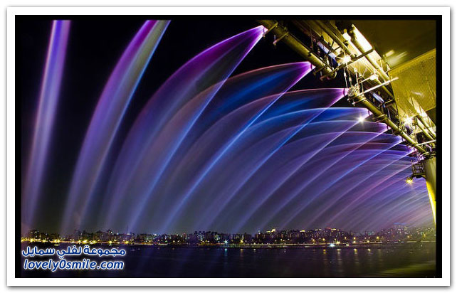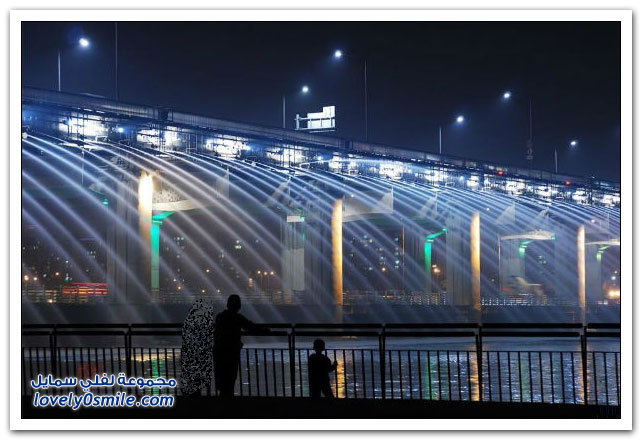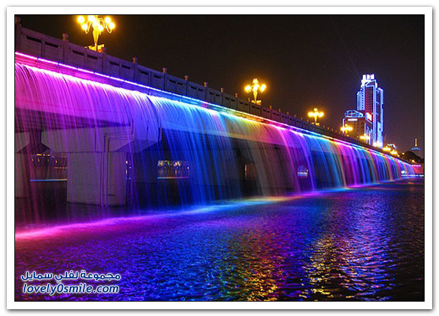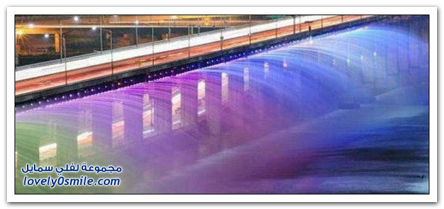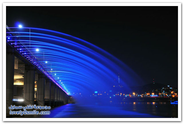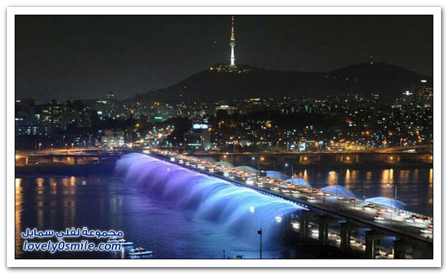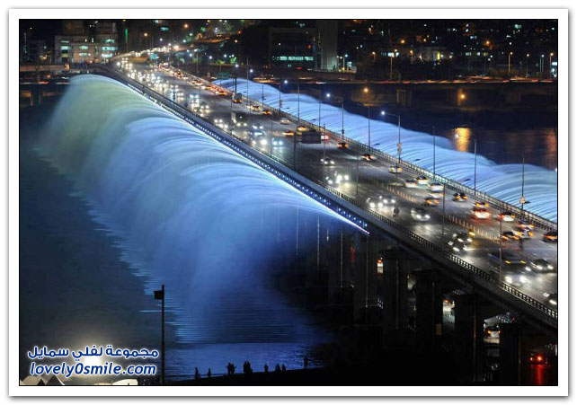 * سيئول / جسر بانبو (Banpo) هو أحد أكثر الجسور شهرة في العالم، يقع في كوريا الجنوبية في وسط العاصمة سيئول فوق نهر هان، هو أطول جسر نافورة في العالم، يتكون من طابقين وقد سُجل رقمًا قياسيًا عالميًا بوجود ما يقارب من 10,000 فتحة لرش المياه على جانبي الجسر بطول 1,140 مترًا.