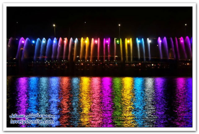 - وفي الليل، وباستخدام 200 مصدر إنارة مجهزة حول النافورة يتم تقديم عرض رائع تظهر فيه المياه الملونة وهى تسقط في النهر مثل قوس قزح.