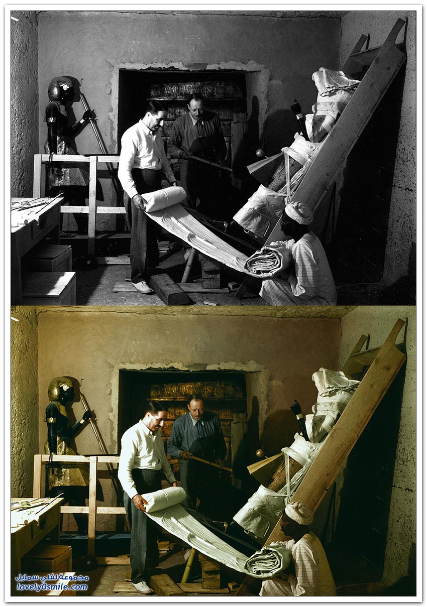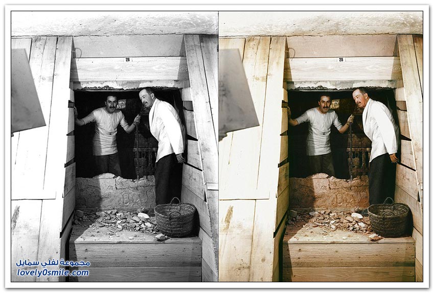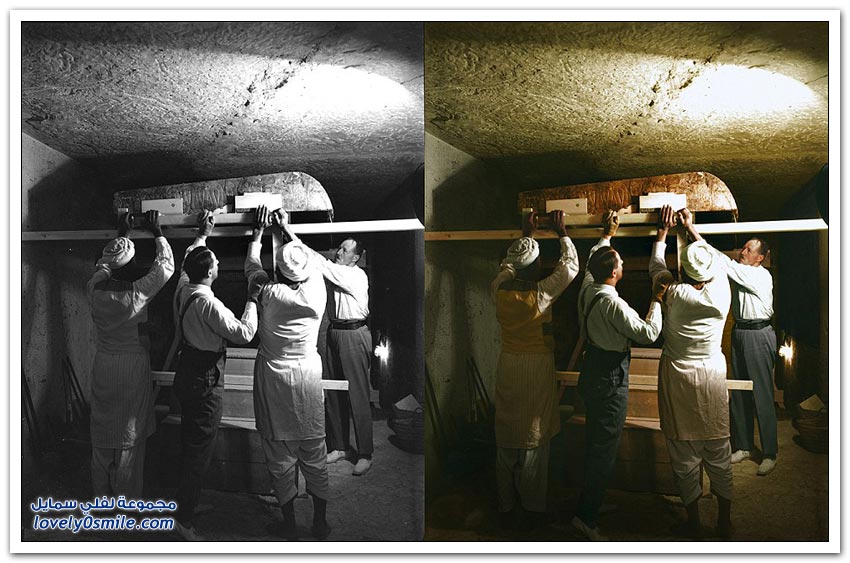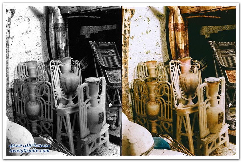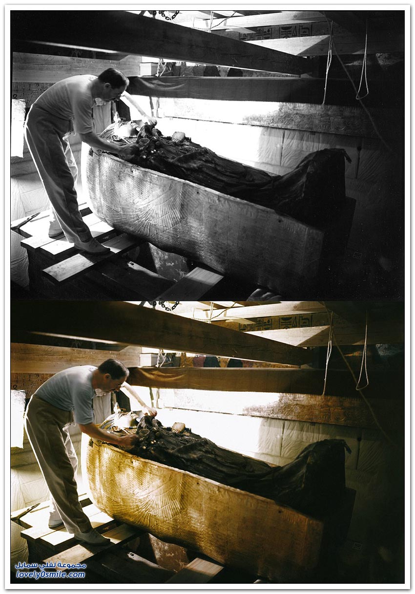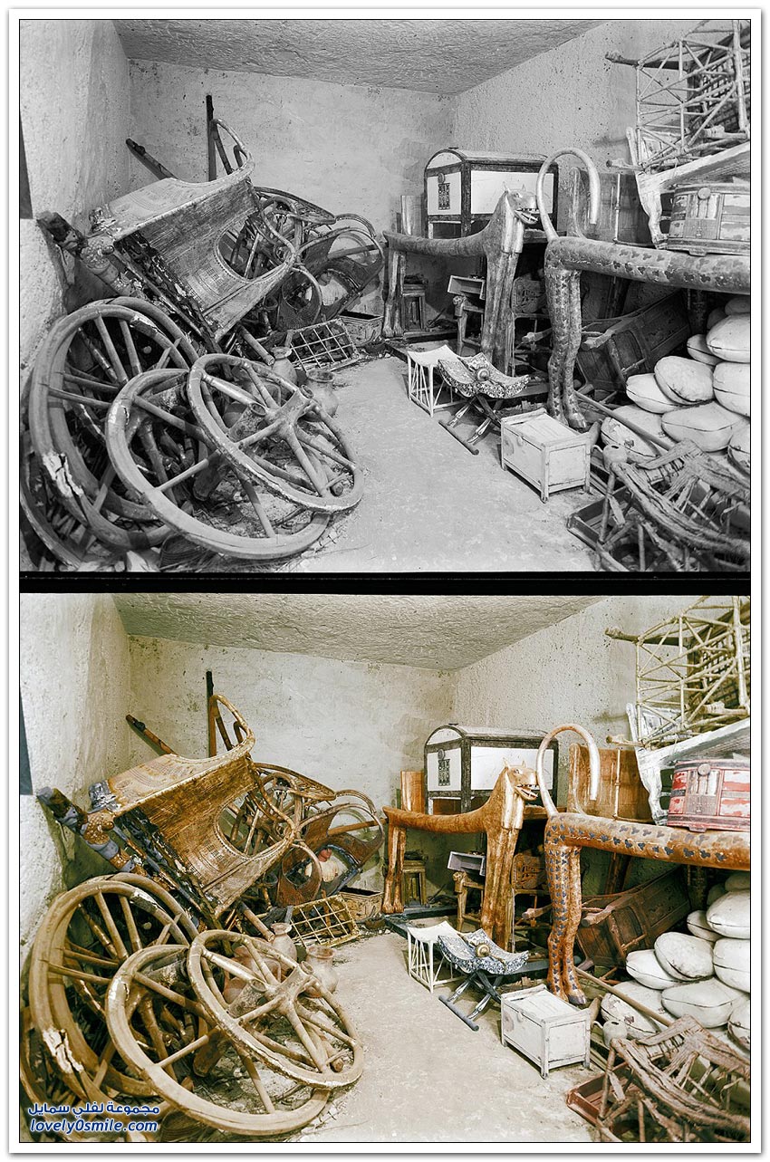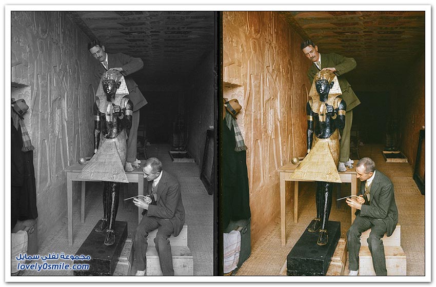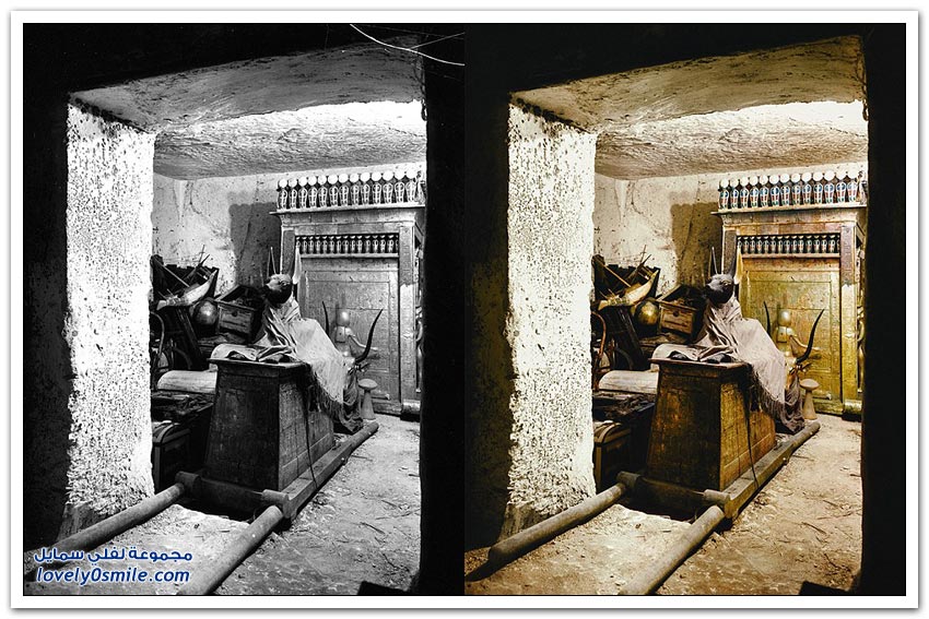 - وبحسب الصحيفة، الصور تم التقاطها بواسطة المصور البريطاني هاري بورتون أثناء عملية الحفر في عام 1922، وتم العمل على تلك الصور بتقنيات متطورة من أجل تلوينها لتكون أشبه بما كانت عليه في الماضي، في محاولة لإعطاء العالم فرصة للتعرف على الوضع في المقبرة بالشكل الطبيعي، بدون الأبيض والأسود الذي عادة ما يخفي التفاصيل المبهرة التي صنعها القدماء المصريون.