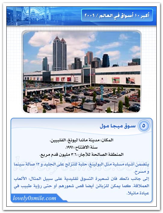 * تحتل 10 مراكز للتسوق مرتبة على أنها الأضخم في العالم, معتمدة على "إجمالي المنطقة الصالحة للأجار" وعلى زيادة مساحة الساحات التي تتبع المركز والتي تتضمن النشاطات المكثرة للإيرادات على سبيل المثال أماكن البيع بالتجزئة, أماكن تقديم العشاء, أماكن التسالي.