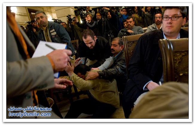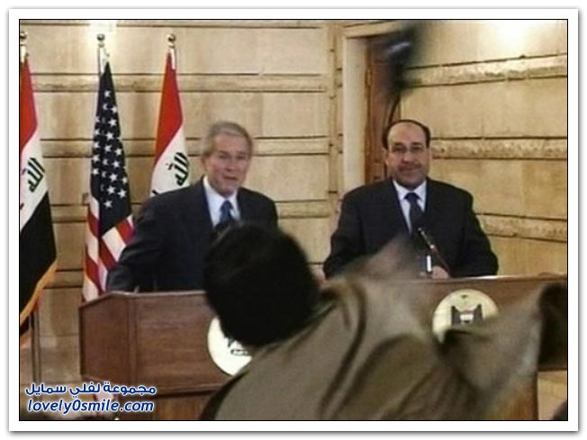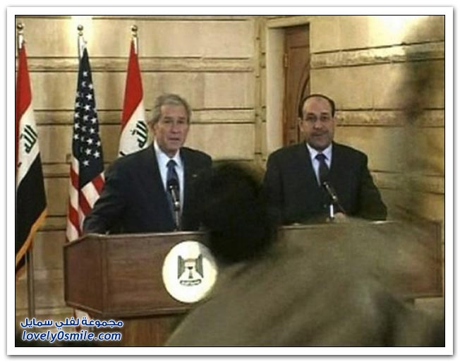 عاش البطل المجاهد (منتظر العراقي ) ظربته كاصواريخ انهالت على رئيس الفاشل بوش واعوانه العراقيين الخونه النصر للأبطال
