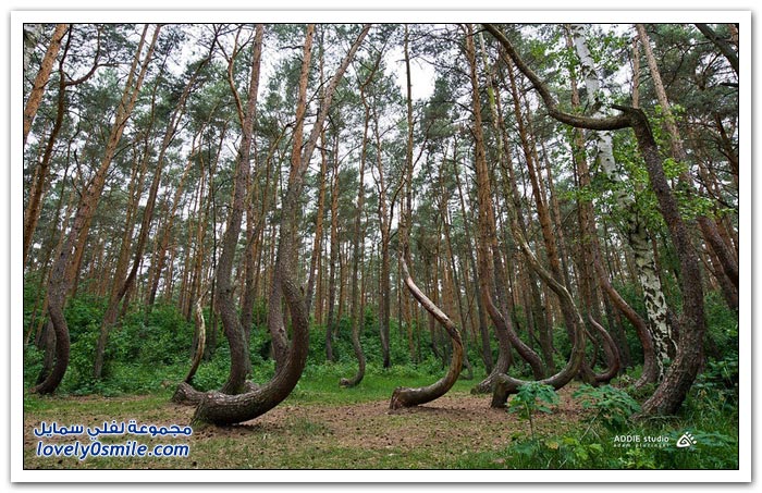 - سميت هذه المجموعة من الأشجار المنحنية "الغابة المنحنية"، ولم يعرف حتى اليوم السبب الحقيقي لنموها بهذا الشكل، ولكن الأسطورة تقول بأن مجموعة من المزارعين تلاعبوا بالأشجار بعد زراعتها في عام 1930، وكان هدفهم صنع أثاث من الأشكال المنحنية للخشب وقرروا قطعها بعد 10 سنوات ولكن خطتهم فشلت بسبب اندلاع الحرب العالمية الثانية فواصلت الأشجار نموها بالطريقة الطبيعية العمودية.
