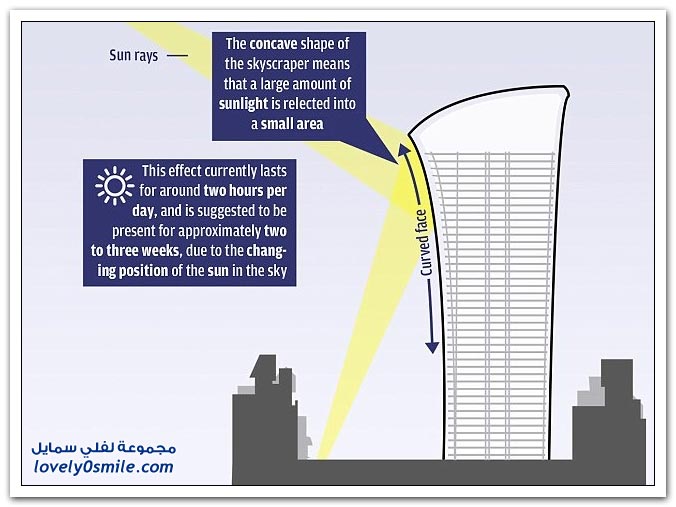 - المشكلة تكمن بالأسطح الزجاجية المقعرة للناطحة ما يتسبب في انعكاس ومضاعفة ضوء وحرارة أشعة الشمس على الطريق وأماكن معينة.