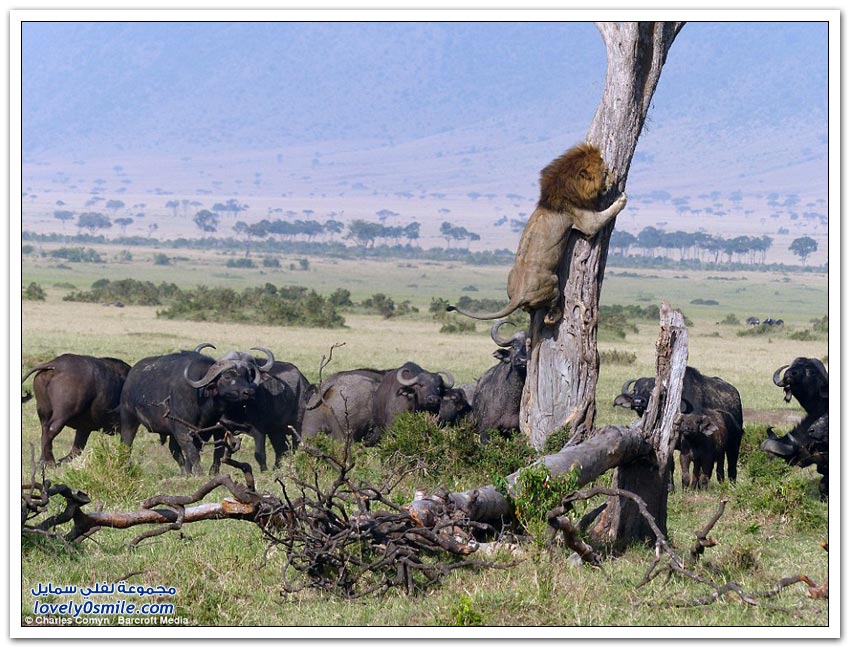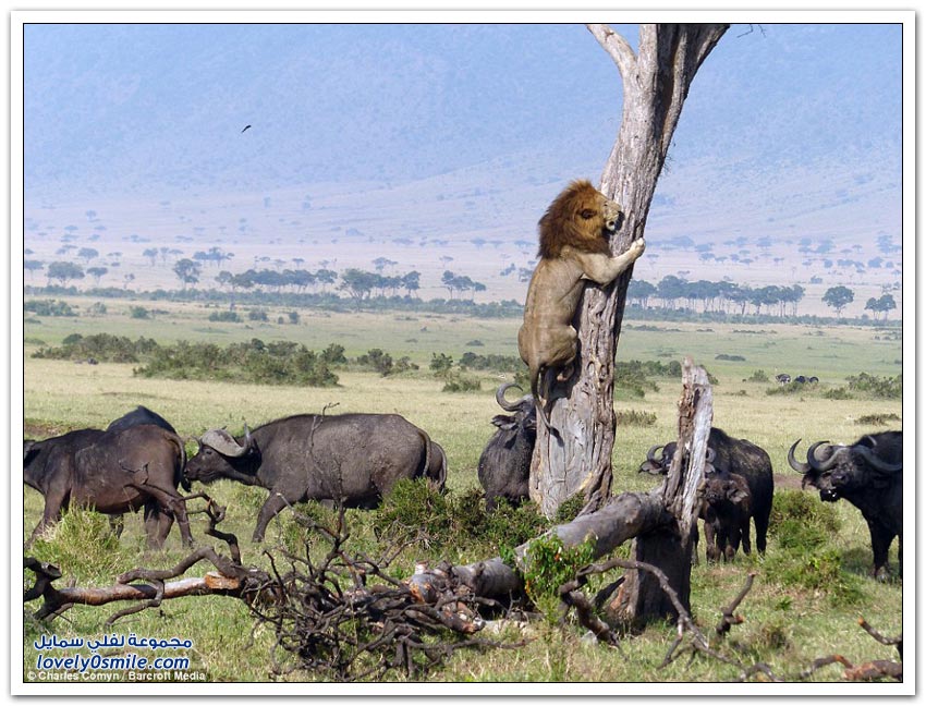 - لم يجد أسد مفراً من قطيع جاموس غاضب، سوى تسلق شجرة قريبة، ليحيط القطيع به لدقائق وسط نظرات هلع على وجه ملك الغابة، كشفتها صور التقطها زوجان ودليلهما خلال زيارة لأدغال كينيا في مارس الماضي.