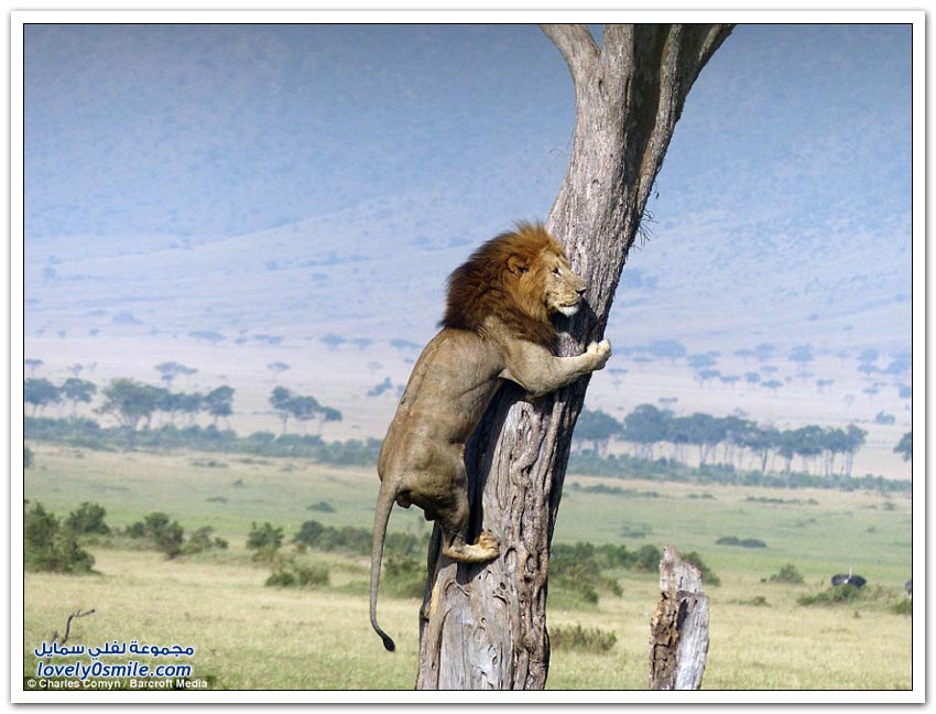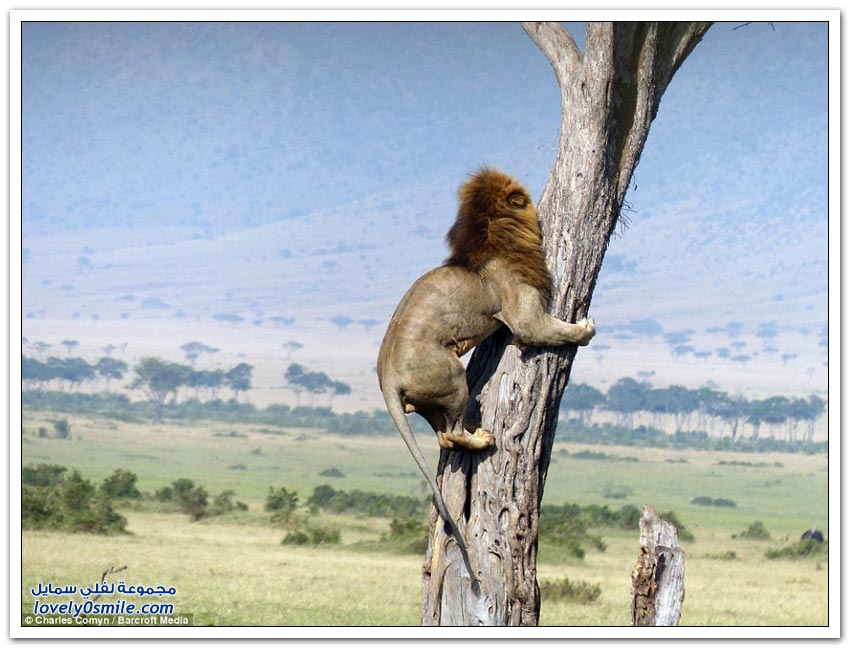 - لكن وبعد ثوان من التشبث بالشجرة، بدأ الأسد المرتعش في الانزلاق من أعلى، وكي يتمكن من الفرار زمجر بقوة ثم قفز وركض بسرعة.