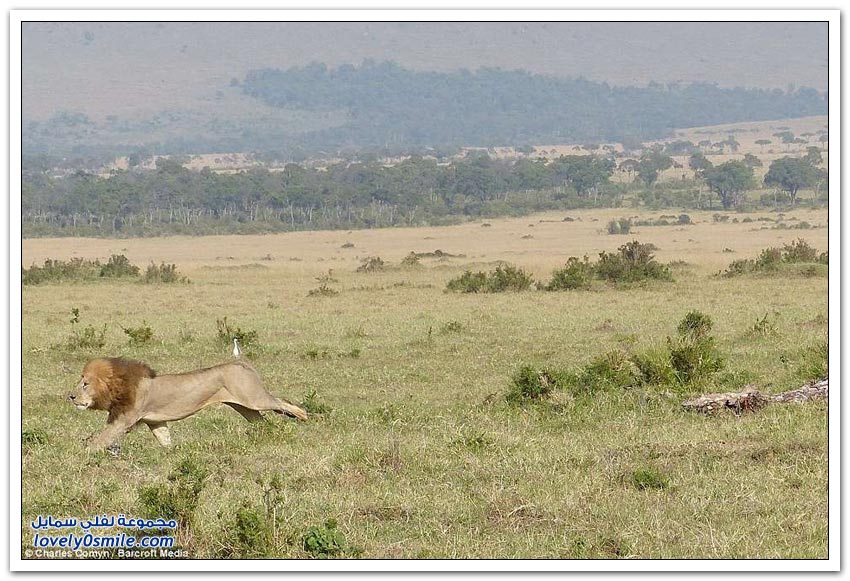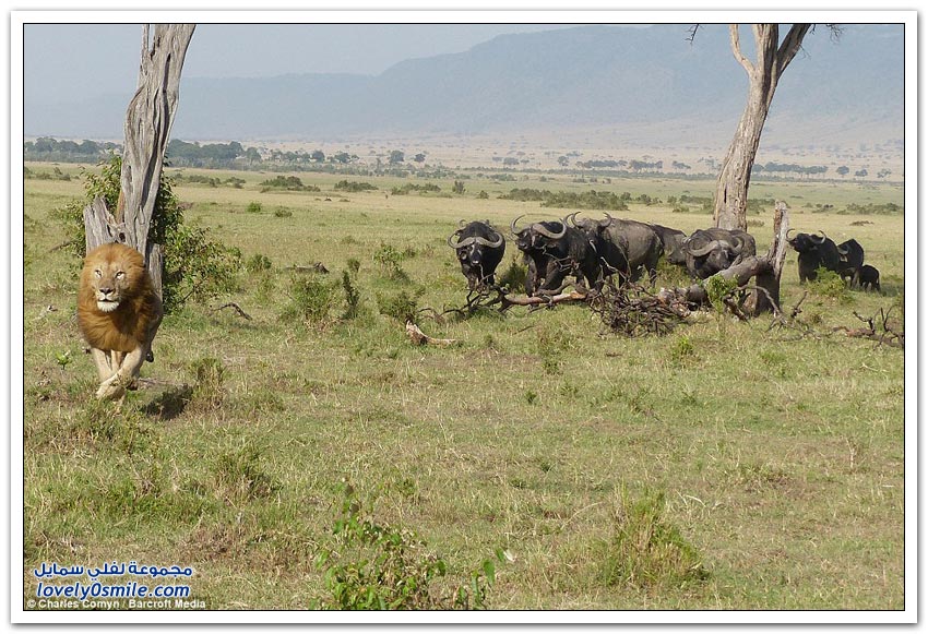 - وتابع كومين: توقفنا بسيارتنا نتابع الجاموس لفترة، ثم حدث أمر غريب عندما أصبح القطيع عصبياً بصورة مفاجئة. فقد ظهر أسد يهرب من مخبئه، ويتسلق شجرة قريبة، فيما طارده قطيع الجاموس.