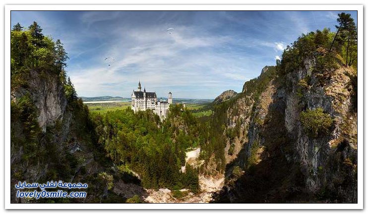 - بدأ الملك لودفيك الثاني ملك بافاريا بناء القصر في نهاية القرن التاسع عشر،الذي عرف تحت اسم "الملك لودفيغ المجنون". تم تصميم القصر من قبل المهندس كريستيان يانك واستغرق بناءه 17 سنة. يقع قصر نويشفاينشتاين بالقرب من قصر هوهينشفانغاو، الذي تم بناءه من قبل والد لودفيك الثاني ماكسميليان الثاني ملك بافاريا. تم إزاحة لودفيغ الثاني من السلطة قبل أنتهاء فترة بناء القصر، ذلك لأنه قام بتبديد أموال الدولة على بناء القصور وأمور أخرى غير ضرورية برأي معارضيه. بعد موته بطريقة غير معروفة حتي الآن، تم فتح أبواب القصر للجمهور. كثير من الروائع الفنية المرسومة على جدران القصر، تم استيحائها من أعمال فاغنر، الذي كان لودفيغ الثاني مولوعا فيه وفي أعماله. تم فقط استكمال تزيين 14 غرفة من غرف القصر ال 360 وبقيت الغرف الأخرى خالية من أية أعمال فنية أو أثاث.